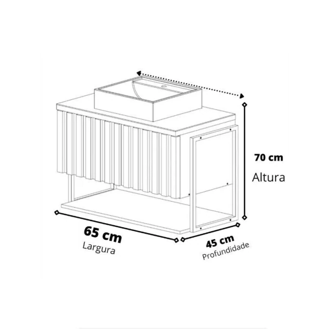 Armário para banheiro suspenso com uma porta ripada, estrutura 100% MDF Revestido em BP, possui um amplo espaço interno, lavatório 100% mármore sintético com mais durabilidade e resistência.