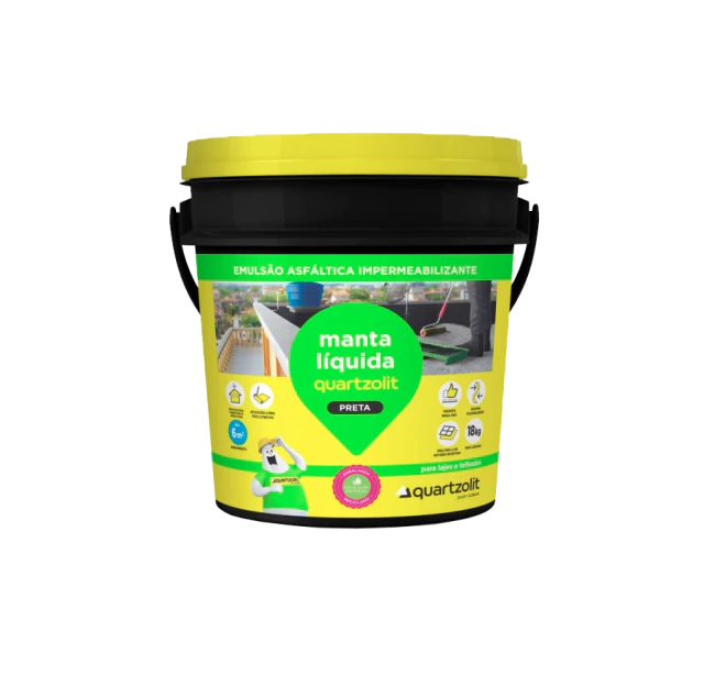 A manta líquida preta quartzolit é uma membrana asfáltica para a impermeabilização de superfícies, como concreto, argamassa, alvenaria, superfícies metálicas e madeira.
