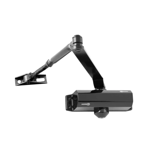 Possui corpo em alumínio e duas válvulas para controle de fechamento, permitindo o amortecimento. Possibilita a instalação em portas que abrem para a direita e para a esquerda (ângulo de abertura de 0° a 150°).