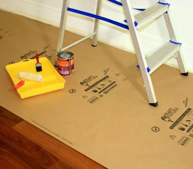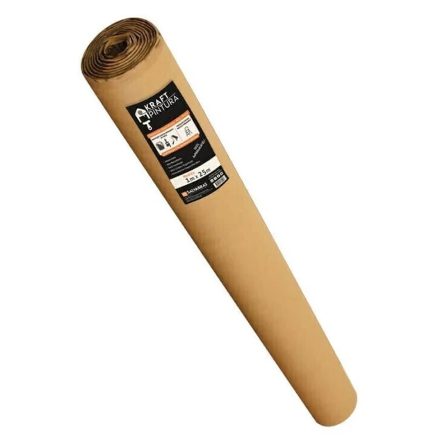 Kraft plastificado, impermeável e absorvente, protegendo contra respingos de tinta e poeira nas superfícies protegidas.
